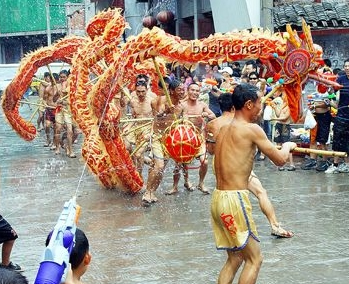 如今已發(fā)展成為對喜慶節(jié)日的慶祝,對美好生活祝福的一種方式。它用鮮棕葉作龍須,用葛藤、黃荊條、松樹枝作龍身,分9節(jié)、11節(jié)、1 3節(jié)、15節(jié)等不同長度的奇數(shù),由9至15人參加舞龍。伴著鑼、鼓、鎖吶的鏗鏘樂曲,一人持“寶”在前,龍舞歡騰時有“二龍搶寶”、“蛇蛻皮”、“烏龍絞柱”等50多種動作玩法。與此同時,身著民族服裝的群眾用臉盆、水瓢、銻桶等容器端水圍繞著龍潑澆,這樣邊舞邊潑水、水潑得越多龍舞得越歡,也預祝大家當年風調雨順,五谷豐登,其場面歡樂喜慶,風趣幽默。已列入我市第一批非物質文化遺產保護名錄。