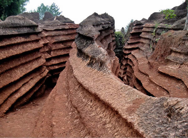 在路邊一棵樹(shù)下,一排直徑有30厘米粗、1米多高,排列得像牙齒一般細(xì)密的石柱躲在樹(shù)蔭下,似乎在躲著陽(yáng)光。幾個(gè)多小時(shí)的探尋過(guò)程中,“石林”總是讓人驚喜,爬行的劍龍、攀行的巨猿、雅致別趣的“蓮花寶座”和莊嚴(yán)的“佛手”,讓人流連忘返 ……當(dāng)?shù)卮迕裣蛴浾呓榻B道,這只是整個(gè)“石林”的一部分,最大的一片石林大約方圓600畝左右,大部分是紅褐色。前幾年有人帶著專家來(lái)考察,說(shuō)這片石林已經(jīng)沉睡了4億年,是揚(yáng)子古海海底沉積的混合泥砂的碳酸鹽物質(zhì)形成的巖石,再經(jīng)地殼運(yùn)動(dòng)和侵蝕、溶蝕作用,就形成今天的奇觀。但卻由于投入資金量及交通等方面的考量,遲遲沒(méi)有人投資。
