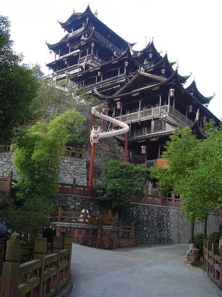 九重天世襲堂是土家風(fēng)情園的精華和靈魂所在。該建筑由土家民間藝人李宏進(jìn)設(shè)計(jì),依80度陡坡而建,高48米,共9重12層,整個(gè)樓房全部用木栓連接,沒有一顆鐵釘,堪稱土家族建筑史上的奇跡。2002年9 月22日,九重天吊腳樓被載入世界吉尼斯世界紀(jì)錄,認(rèn)定其為目前中國(guó)最大、最高、最完美的木質(zhì)結(jié)構(gòu)吊腳樓。2001年4月6日,朱镕基總理視察土家風(fēng)情園時(shí),對(duì)九重天贊不絕口:“一批民間匠人能造出這樣輝煌的吊腳樓,而且還解決了力學(xué)的問題,真是不簡(jiǎn)單!鼻迦A大學(xué)著名建筑學(xué)家何重義先生說:“張家界土家風(fēng)情園完全可以和蘇州的園林相媲美。特別是九重天世襲堂,猶如玉宇瓊閣,令人神往!”古人說,天有九野,地有九州,土有九山,山有九寨。古人又把九重叫做天,說天有九重,最上一重是上帝和君主居住的地方,所以我們叫它“九重天”。