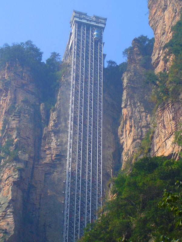 百龍?zhí)焯?BR>    百龍?zhí)焯荩怪备卟?35米,運(yùn)行高度326米,由154米山體內(nèi)堅(jiān)井和172米貼山鋼結(jié)構(gòu)井架等組成,采用三臺(tái)雙層全暴露觀光電梯并列分體運(yùn)行,每臺(tái)次載客50人次,運(yùn)行速度3米/秒,三臺(tái)同時(shí)運(yùn)行每小時(shí)往返量達(dá)4000人次。百龍?zhí)焯莸男藿▽?shí)現(xiàn)“山上游,山下住”的目標(biāo),提供了交通保障,將袁家界天下第一橋、迷魂臺(tái)、天懸白練以及烏龍寨、楊家界等絕世美景從幕后推向了前臺(tái),并將天子山、袁家界、金鞭溪等精品旅游線路連為一體,解決了多年困擾景區(qū)的交通瓶頸問(wèn)題。
