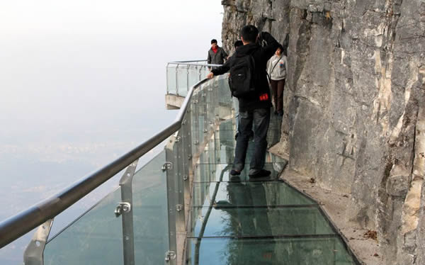 玻璃棧道是張家界天門山景區(qū)繼懸于峭壁之上的鬼谷棧道、憑空伸出的玻璃眺望臺(tái)、橫跨峽谷的木質(zhì)吊橋后打造的又一試膽新景點(diǎn)。這條看著就讓人腿軟的玻璃橋給人帶來的刺激震撼感可與舉世聞名的美國(guó)大峽谷玻璃走廊“天空之路”媲美。