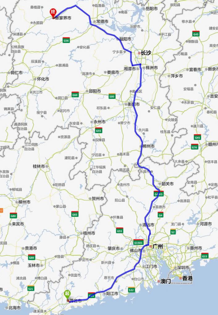 茂名去張家界自駕車自助游線路圖全程高速):