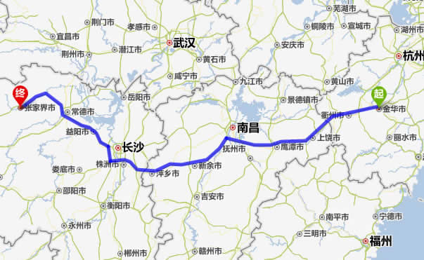 金華去張家界自駕車自助游線路圖全程高速):